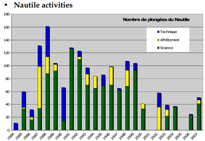 法國(guó)1984年研制成的“鸚鵡螺”號(hào)潛水器最大下潛深度可達(dá)6000米,活動(dòng)范圍可以遍及全球海域的97%。累計(jì)下潛了1700多次,完成過(guò)多金屬結(jié)合區(qū)域,深海海底生態(tài)等調(diào)查,以及沉船、有害廢料等搜索任務(wù)。該深潛器的操作和維護(hù)由GENAVIR進(jìn)行,Ifremer負(fù)責(zé)Nautile的技術(shù)支持和改進(jìn)。載人球體的材料為鈦合金,深潛器前面裝有兩個(gè)機(jī)器手臂,可用于采集樣品。Nautile的工作小組至少有8個(gè)人,包括2個(gè)潛航員(其中一個(gè)可作為監(jiān)督者)、2個(gè)精通電子的潛航員、2個(gè)導(dǎo)航專家、2個(gè)精通于機(jī)械的潛航員。“鸚鵡螺”號(hào)于1987至1998年期間,共打撈文物1500多件,它用兩個(gè)機(jī)器手臂將文物放在箱子里,然后帶回水面。1998年,“鸚鵡螺”號(hào)將一個(gè)很大(長(zhǎng)8米,寬7米)的船殼的碎片帶回水面。它的機(jī)器手臂非常靈活,即使是遇到一個(gè)水晶花瓶,也能夠完好無(wú)損地被帶回水面。