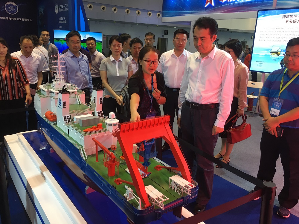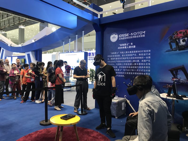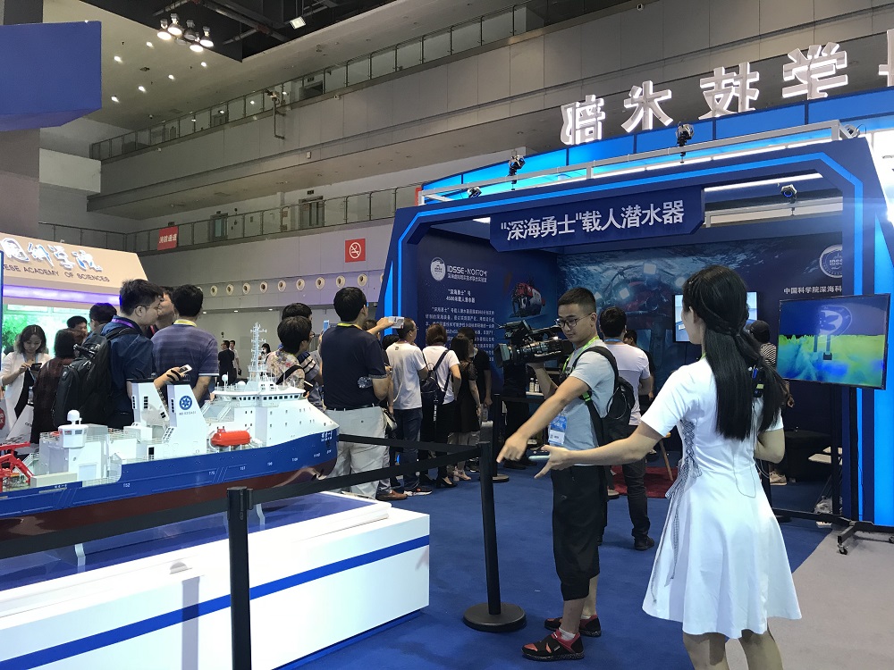 為深入貫徹軍民融合發(fā)展戰(zhàn)略,促進軍民融合產(chǎn)業(yè)創(chuàng)新發(fā)展,中國科學院深海科學與工程研究所應科學技術部的邀請,參加此次展會。深海所展出了“探索一號”科考船及其搭載的深海儀器設備模型,以視頻形式向大眾展示了中科院深淵科考隊“探索一號”到馬里亞納海溝挑戰(zhàn)者深淵開展深淵科考的情況。并利用虛擬現(xiàn)實技術(VR)多維解析了我國擁有自主知識產(chǎn)權的載人潛水器“深海勇士”號的結構原理,通過VR場景模擬讓觀眾親身體驗乘坐“深海勇士”號潛入深海進行科考作業(yè)的場景。