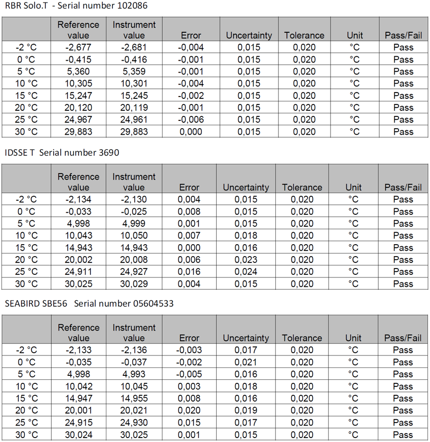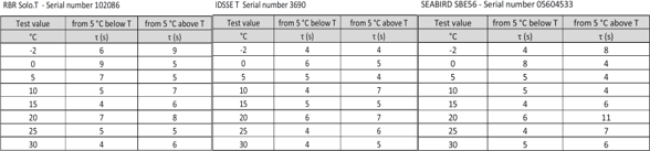 自2018年6月開始,Trescal機構選取了海鳥(SBE 56)、RBR (Solo.T)、NKE(S2T)、NKE(WiSens)等國際上知名海洋傳感器制造商供應的同類溫度傳感器,進行比測試驗,在長達24周的測試期內,分別完成了測量精度、響應時間等一系列性能測試。測試結果顯示:RBR Solo.T、IDSSE T和SBE 56的測量誤差均不超過±0.020℃,其中RBR Solo.T的最大誤差為-0.006℃,IDSSE T的最大誤差為0.016℃,SBE 56的最大誤差為0.020℃;在響應時間測試中,RBR Solo.T、IDSSE T和SBE 56的系統整機響應時間均維持在11s以內,測試結果比對圖如下: