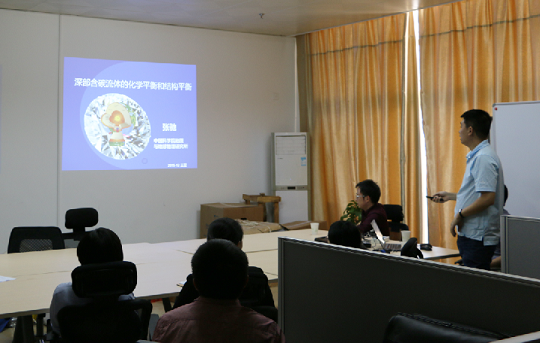 1216日,應深海極端環境模擬研究實驗室周義明研究員的邀請,中科院地質與地球物理研究所張志剛副研究員、張弛副研究員、耿明博士到所訪問交流,分別作了題為“基于分子模擬的含水流體超臨界狀態方程及其應用”、“深部含碳流體的化學平衡和結構平衡”、“天然氣分子在微納孔隙中擴散研究”的學術報告。