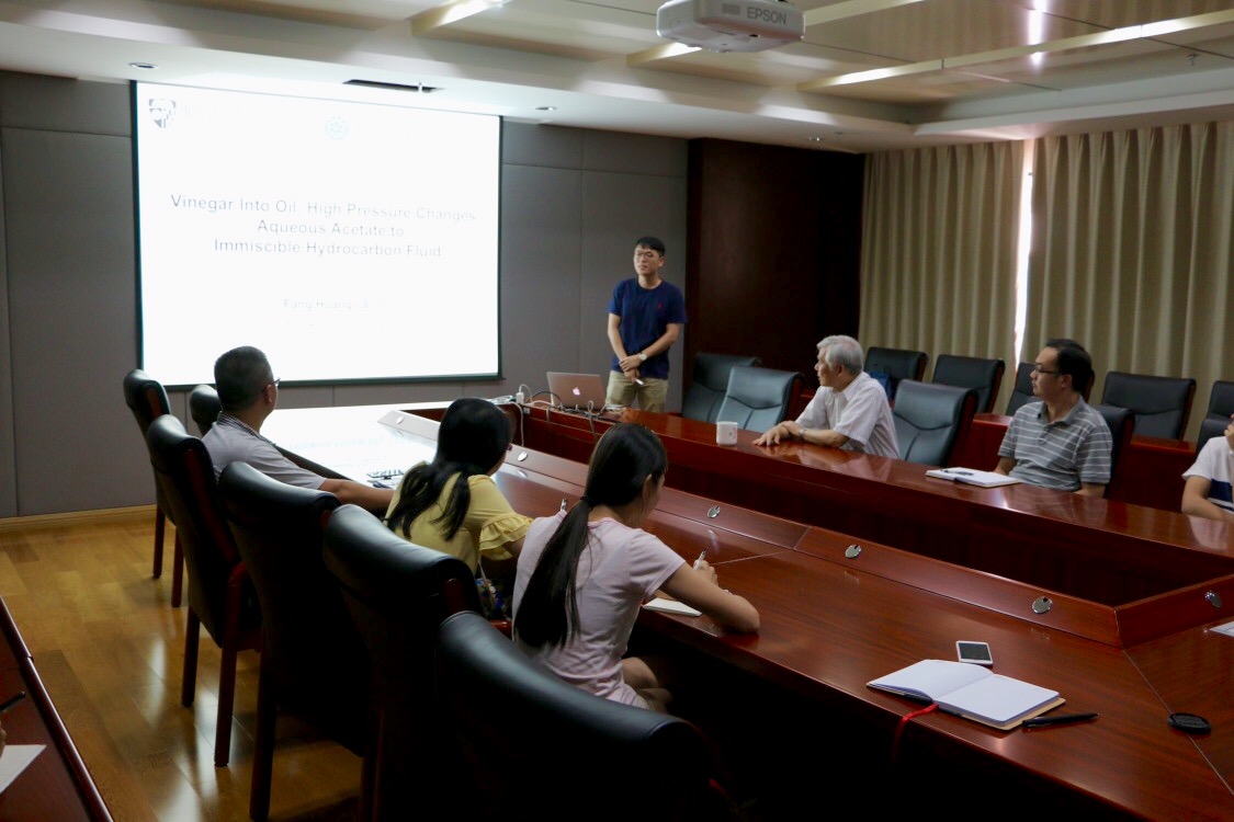 7月12日,應(yīng)深海極端環(huán)境模擬研究實驗室周義明研究員的邀請,美國約翰霍普金斯大學(xué)地球與行星科學(xué)系博士生黃放到所訪問交流,作了題為“Vinegar into Oil: High Pressure Changes Aqueous Acetate to Immiscible Hydrocarbon Fluid”的學(xué)術(shù)報告。