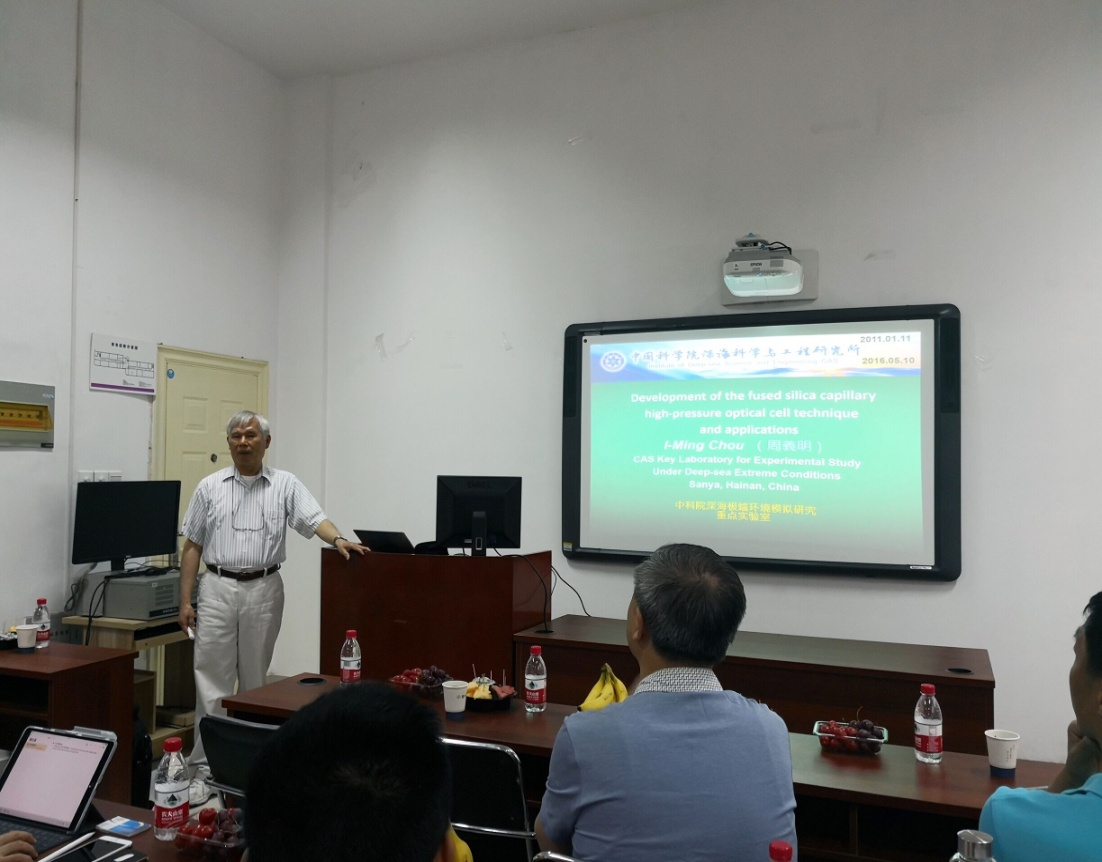 報(bào)告中,周義明研究員介紹了高壓微型可視毛細(xì)硅管與拉曼光譜聯(lián)用技術(shù)的研發(fā)歷史背景及多位從中國(guó)到美國(guó)地質(zhì)調(diào)查局其實(shí)驗(yàn)室參與初期研發(fā)工作的訪問學(xué)者的貢獻(xiàn),同時(shí)也介紹了目前在深海極端環(huán)境模擬研究實(shí)驗(yàn)室的主要工作內(nèi)容及面對(duì)的挑戰(zhàn)和前景。目前,此高壓微型可視毛細(xì)硅管與拉曼光譜聯(lián)用技術(shù)已被廣泛的應(yīng)用到與地質(zhì)及環(huán)保相關(guān)的流體研究,主要包括在中國(guó)、美國(guó)、加拿大、法國(guó)、及澳大利亞的科研機(jī)構(gòu)。其他多位與會(huì)者及前訪問學(xué)者也介紹了他們?cè)谶@方面的科研進(jìn)展并熱烈地參與交流討論。