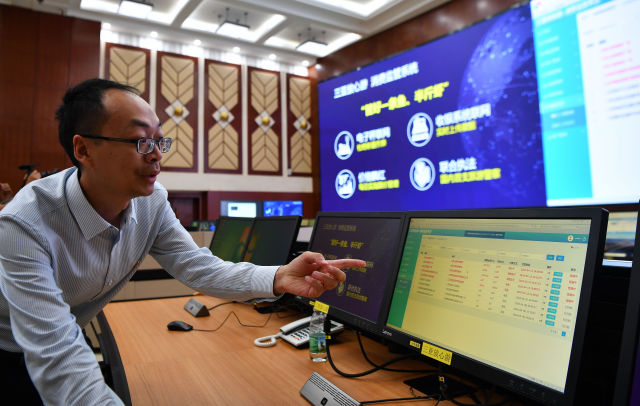 4月13日,海南省政務數據中心工作人員朱熀鋒介紹數據中心利用互聯網遠程監控實時了解海鮮價格的情況。新華社記者 郭程 攝?
