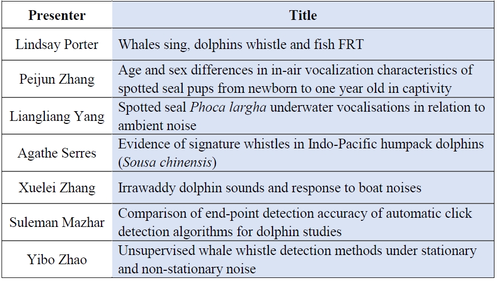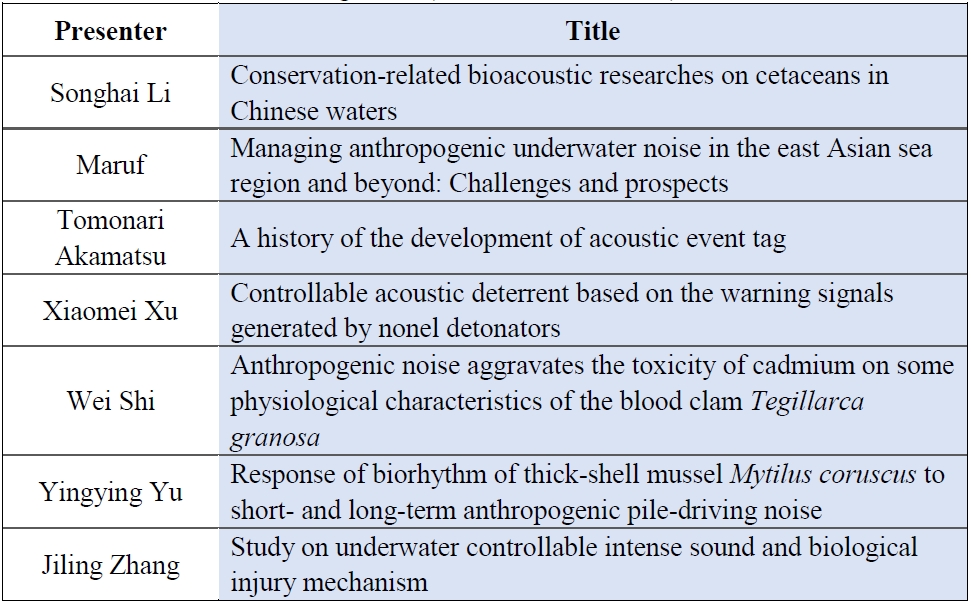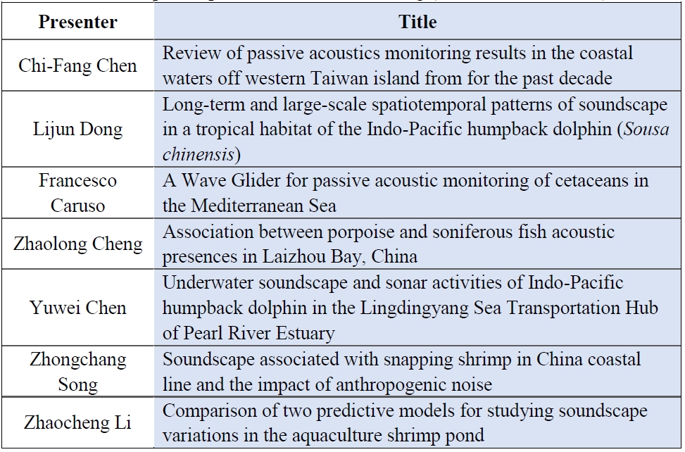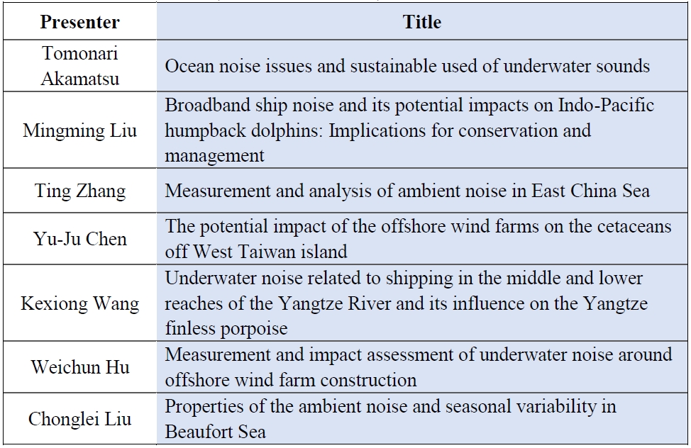 Extensive marine engineering works are occurring in Asian waters, where there is high marine biodiversity. Maritime constructions, offshore wind power installations, underwater mining, shipping, fisheries, and geological studies produce a wide variety of noises in the water. Marine mammals, sea turtles, fishes, and aquatic invertebrates all could be affected by the exposure to underwater noises. At this moment, baseline information on ecologically important marine organisms, and proposed scientific standards of noise impact on these marine organisms are still quite limited within Asian waters. Reliable ocean noise measurements and an evaluation of its effects in coastal and deep waters are needed. The Oceanoise Asia symposium focuses on current available knowledge and future perspectives on physiology, ecology and behavior of ecologically and economically important marine organisms, physical and biological sound measurement and biological noise response observations. The 3rd Oceanoise Asia aims at promoting scientific research and awareness about the impacts of noise on the marine organisms in Asian waters.