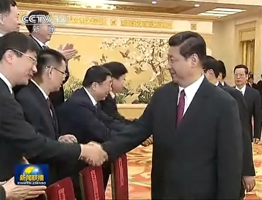 5月17日,黨和國家領導人習近平、李克強、劉云山、張高麗等在北京人民大會堂會見載人深潛先進單位和先進工作者代表。圖為習近平與王越超親切握手。