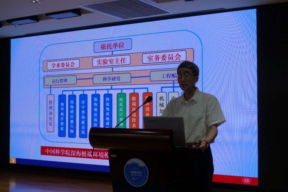 驗收論證會上,重點實驗室主任梅升華研究員代表重點實驗室做了驗收報告,向?qū)<医M和院機關(guān)領(lǐng)導介紹了籌建期內(nèi)重點實驗室的建設情況。周義明研究員、蔣磊正高級工程師和張維佳副研究員分別在室內(nèi)極端環(huán)境模擬手段、深海超高壓模擬實驗裝置和深海微生物適應性機制三個方向做了學術(shù)報告,充分展示了重點實驗室的研究優(yōu)勢和學科特色。