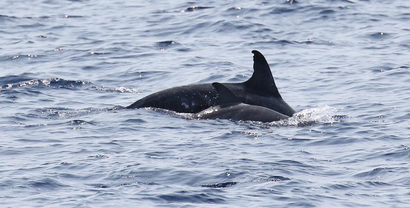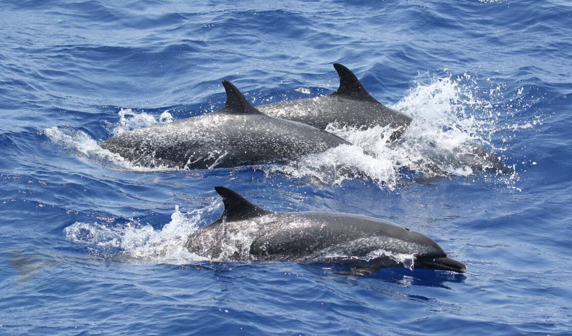 航次采用目視考察手段、截線抽樣方法,在海南島東南海域陸坡區(qū)域進(jìn)行科學(xué)考察,以了解該區(qū)域深潛和遠(yuǎn)海性鯨類物種組成、空間分布和行為特征。考察過程中,科考隊員在南海北部海域發(fā)現(xiàn)了大量的鯨類動物,一共目擊到深潛和遠(yuǎn)海性鯨類動物27群次,其中可確定的深潛鯨類物種4種,分別為抹香鯨、柯氏喙鯨、短肢領(lǐng)航鯨、花紋鯨(瑞氏海豚);遠(yuǎn)海性海豚物種3種,分別為熱帶斑海豚、條紋海豚、弗氏海豚。另有2個物種還有待進(jìn)一步確定。考察結(jié)果顯示,考察海域目前擁有較高的深潛和遠(yuǎn)海性鯨類物種多樣性;除熱帶斑海豚外,其它動物群體均是科研人員在考察海域的首次發(fā)現(xiàn)和記錄;其中,抹香鯨和喙鯨群體都觀察到母子對,表明南海北部考察海域極有可能存在抹香鯨和喙鯨的定居群體。這些發(fā)現(xiàn)填補了南海鯨類尤其是南海深潛鯨類研究的空白。