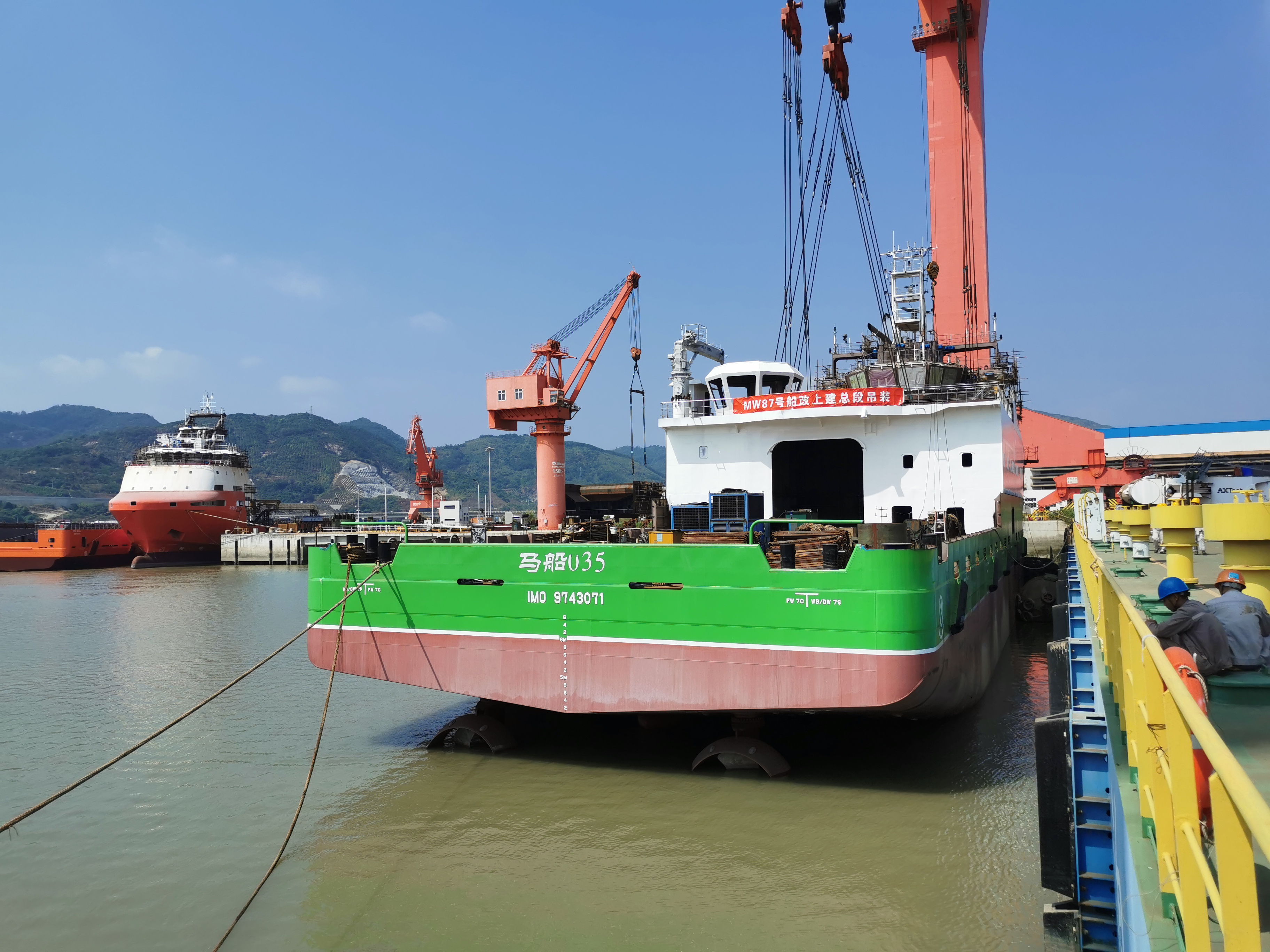 10月10日上午,福建馬尾船廠,萬米載人潛水器支持保障母船MW87號(暫定名)順利完成上建總段吊裝,這標志著該船主體結構建造完成、科考設備及其科學與工程實驗室等改造布局已確定,是船舶建造改造的關鍵節點之一。