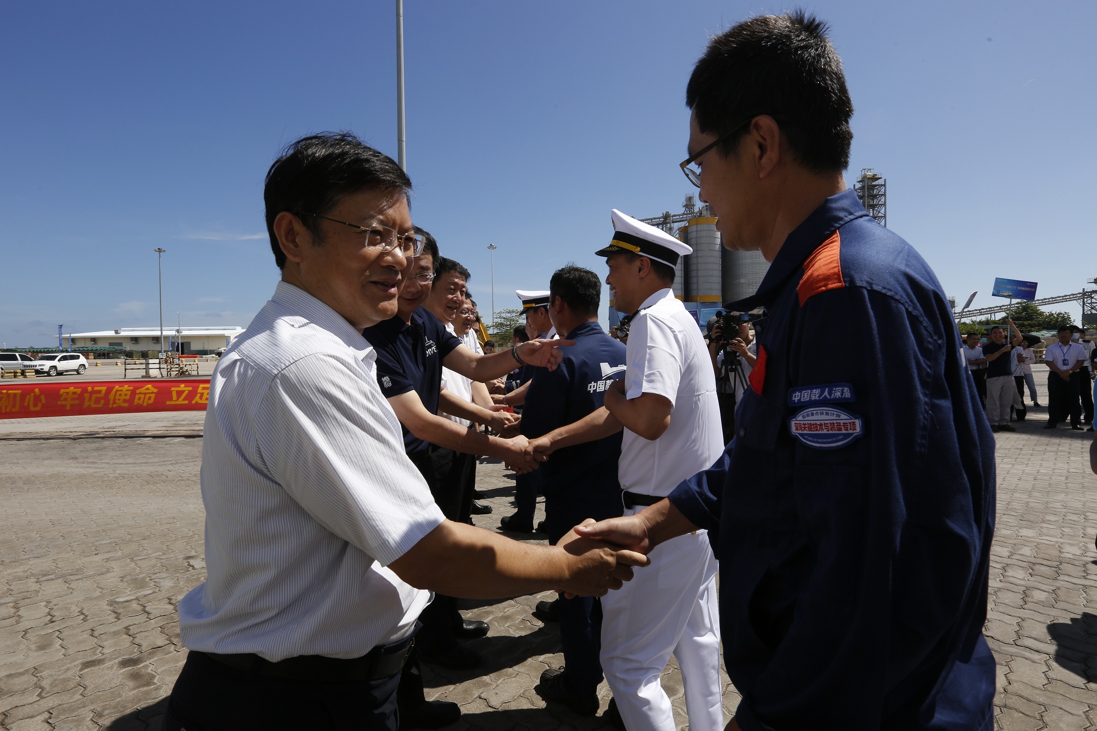 當天下午,驕陽似火,“探索二號”船搭載著60名參加首航的科考隊員順利返航,遠遠看去,船舶右舷橫掛著兩條巨型橫幅——“砥礪探索 不懈奮斗 勠力開創(chuàng)中國深海科技新征程”;“三亞,你好,我回家了!”,橫幅內(nèi)容振奮人心、充滿溫情,首次亮相的“探索二號”船緩緩駛入南山港碼頭,下午3點整,準時停靠,參航人員依次從甲板下船,和接船來賓一一握手擁抱,場面感人。