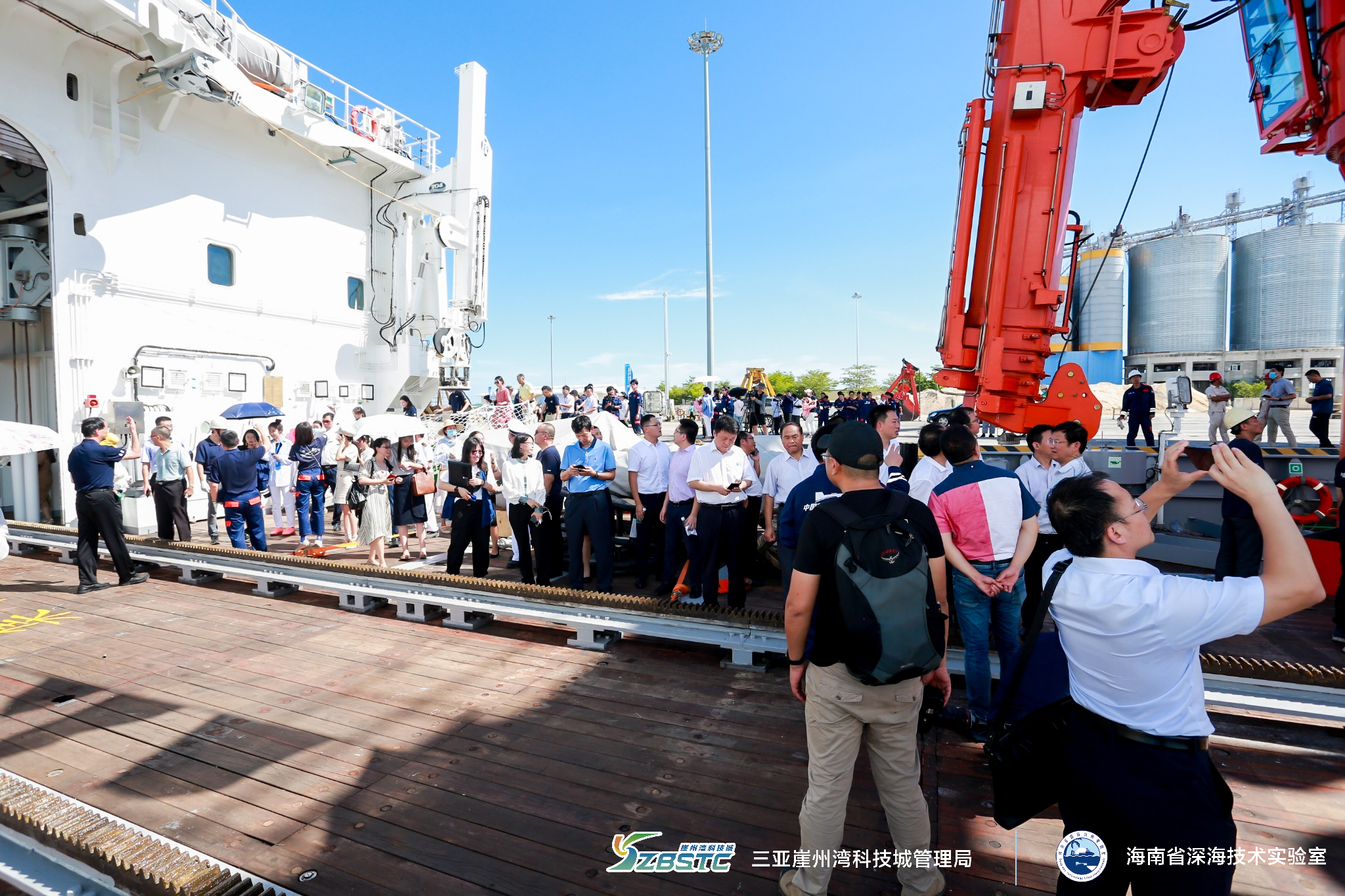 6月25日, “探索二號”船從福建馬尾造船廠碼頭啟航,經(jīng)過830海里的航程, 28日下午,順利抵達三亞崖州灣科技城南山港碼頭。來自海南省人民政府、海南省科學技術廳、深圳市規(guī)劃和自然資源局、中國船舶集團702研究所、704研究所、武漢理工大學、中科院沈陽自動化所、中科院聲學研究所、三亞崖州灣科技城管理局等相關單位代表共200余人參加接船儀式。