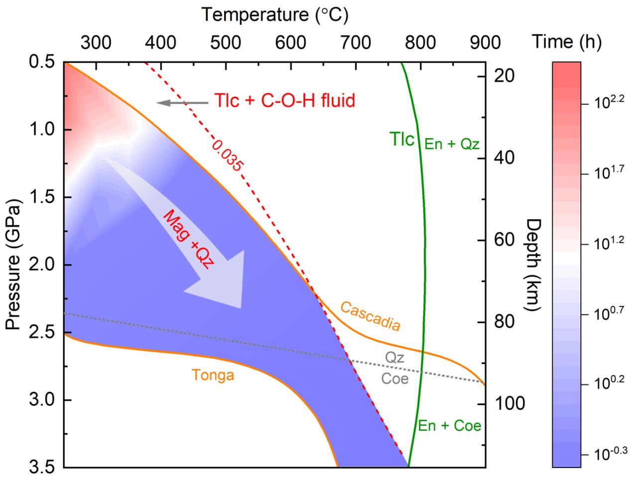 本研究采用金剛石壓腔(DAC)結(jié)合原位拉曼光譜技術(shù),系統(tǒng)研究了俯沖帶溫度壓力條件下滑石與C-O-H流體的碳酸化反應(yīng)過程。研究結(jié)果發(fā)現(xiàn)滑石在溫度> 250°C、壓力>1 GPa時,可快速轉(zhuǎn)化為菱鎂礦與石英,有效地將流體中的CO2封存到新形成的熱力學更穩(wěn)定的菱鎂礦中,從而被挾帶進入地球深部(見附圖)。此外,滑石碳酸化后還可能通過改變俯沖帶礦物組成,影響到包括地震活動性在內(nèi)的動力學過程。本研究的結(jié)果構(gòu)建了滑石碳酸化反應(yīng)的熱力學相圖,為更好地理解地球深部碳循環(huán)過程和受相變影響所致的地球動力學行為提供了必要的實驗約束。