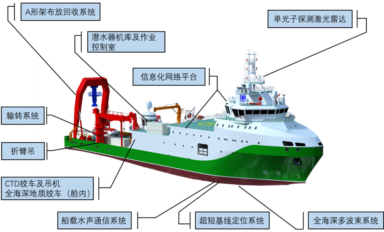 “探索一號”船,由科技部和中國科學院支持購置和改建,分別于2016年5月、2017年8月和2019年6月完成三期改建,主要任務是搭載奮斗者號載人潛水器在全球深淵區開展6000米以深深潛作業和綜合調查任務。