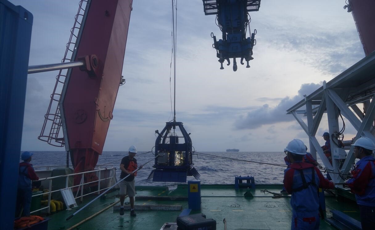 深海分體式電視抓斗用于可視化抓取深海底巖石樣品,最大工作水深6000米,空氣中重量3.7噸,水中重量2.9噸,最大取樣區(qū)域1.7m*1.2m,最大取樣體積2.6m3,分體式設(shè)計使得裝置電氣籃和斗體解耦,保證抓斗能夠在三級海況以內(nèi)順利進行海上作業(yè)。電視抓斗參加“探索一號”TS09航次,在馬里亞納海溝弧后張裂區(qū)域成功完成8個站位海底巖石可視化抓取,獲取大量海底巖石樣品,最大作業(yè)深度3535米。由于取樣靈活,操作簡單可靠,具備一定市場潛力,該分體式電視抓斗已完成成果轉(zhuǎn)化。?