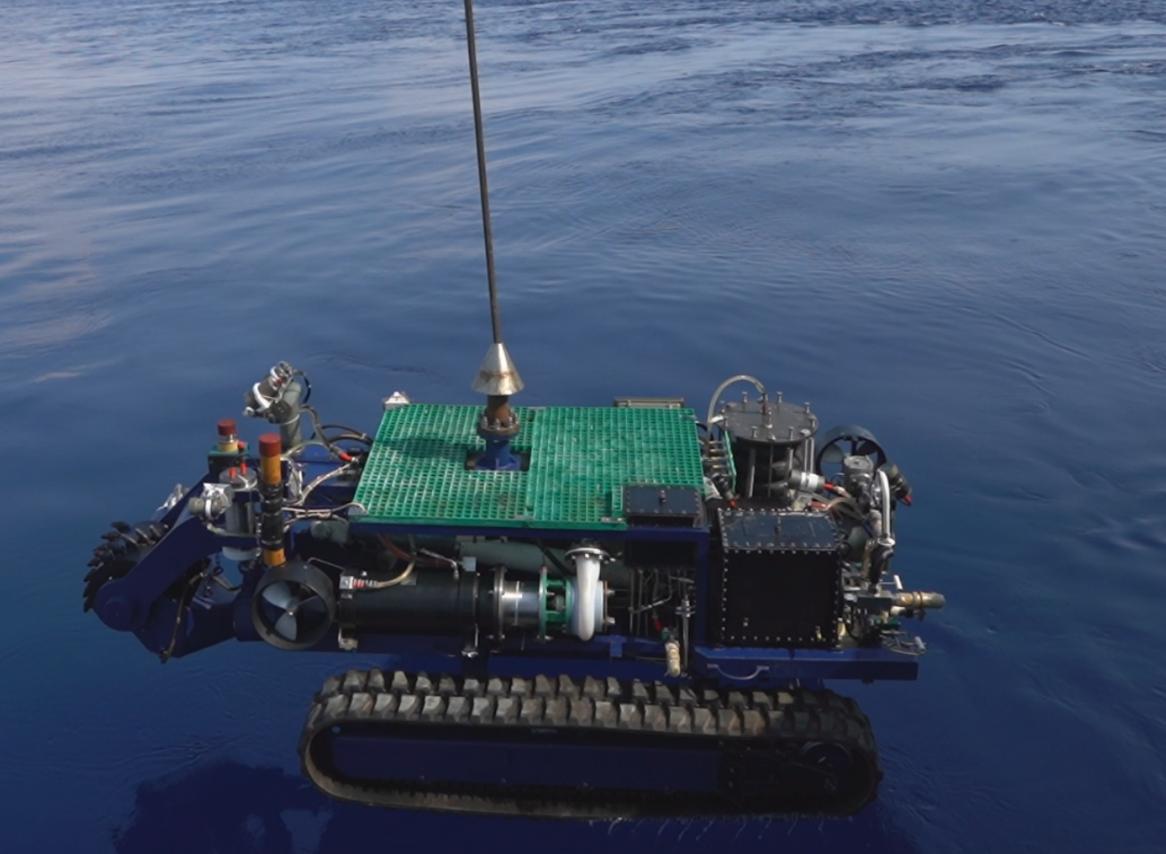 深海富鈷結(jié)殼規(guī)模采樣車設(shè)計深度4500m,裝置長4.3m,寬2.3m,高1.6m,空氣中重量4.1噸,水中重量3.0噸,裝機容量80kW,每小時完成500kg富鈷結(jié)殼礦物的剝離、破碎和收集。該裝置于2018年4月在南海海域2500m水深開展了海上試驗,并獲取富鈷結(jié)殼礦石樣品,驗證了深海富鈷結(jié)殼采樣裝置的作業(yè)功能,包括布放回收時自動定向功能、海底行走功能、海底礦石破碎收集功能力,在極端復雜海底地形中具備作業(yè)能力。