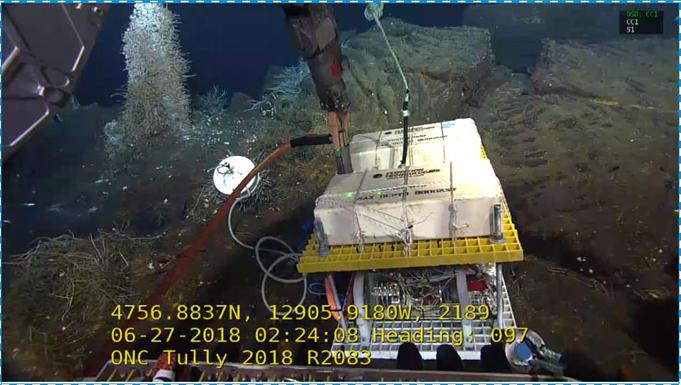 另外還研發(fā)一套紫外激光拉曼光譜儀,于2018年6月27日在加拿大海底觀測網(wǎng)(Ocean Networks Canada,ONC) Endeavour節(jié)點成功聯(lián)網(wǎng)運行。通過加拿大Tully調(diào)查船和ROV ROPOS將設(shè)備布放到一處低溫熱液口,開展長期低溫熱液口生物地球化學過程監(jiān)測和原位實驗。